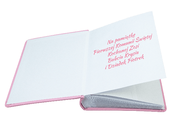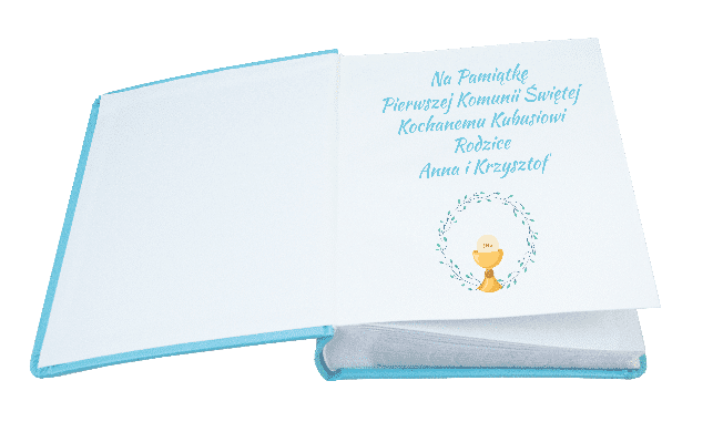 Każda okładka w albumie może być dodatkowo spersonalizowana o dodatkowy grawer komunijny który będzie niesamowitą pamiątką uroczystości Pierwszej Komunii Świętej .
