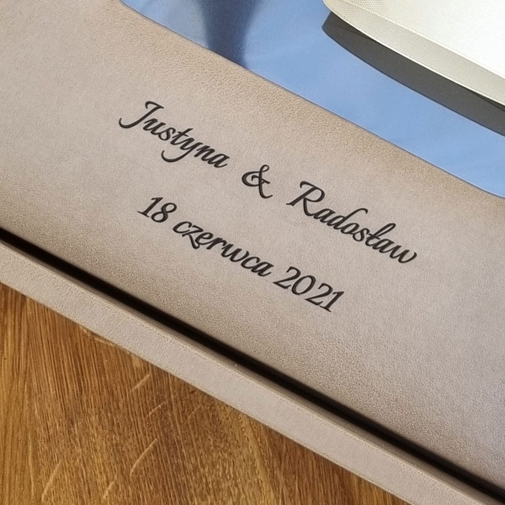 Napis na albumie (skóra granatowa G8a) oraz na Wood ( drewienko wtopione w okładkę etui na pendrive)