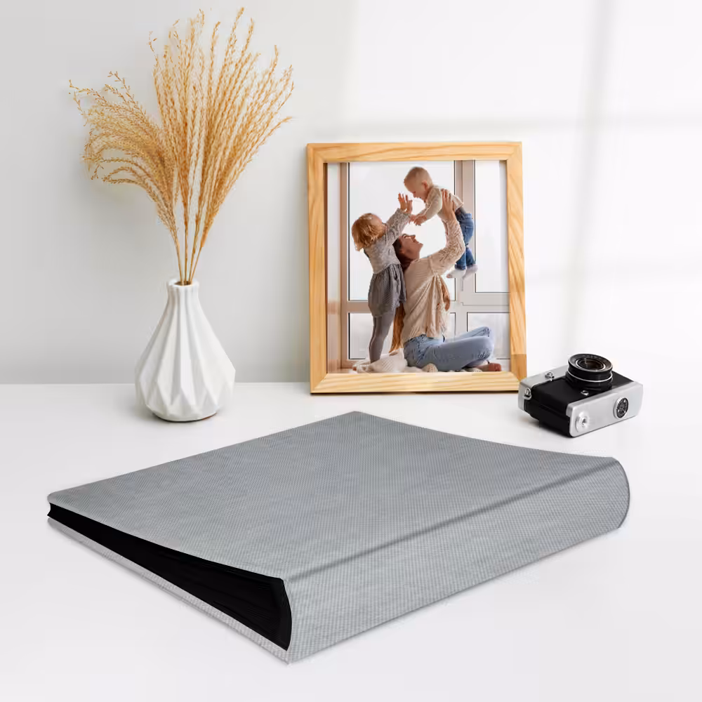 Album do wklejania zdjęć, klasyczny – Płótno: popielaty len. Idealny na zdjęcia w popularnych formatach 10×15, 15×21 oraz wiele więcej np. Instax i fotobudki.