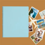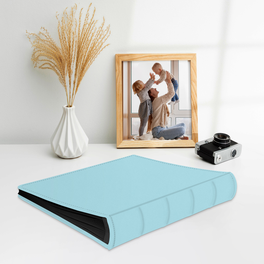 Album do wklejania zdjęć, klasyczny – skóra galanteryjna: pastelowy błękit. Idealny na zdjęcia w popularnych formatach 10×15, 15×21 oraz wiele więcej np. Instax i fotobudki.