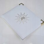 Album studyjny na zdjęcia wsuwane pod ramkę ze złota lamówką , wykonany w białej skórze galanteryjnej z srebrnym napisem komunijnym. Album na 6 zdjęć, formatu 15×21. (Wyprzedaż)