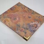 Album wykonany w okładzinie introligatorskiej widocznej na zdjęciu, ze złotymi ozdobnymi okuciami oraz złoconym  napisem “Nasz Ślub”. W środku albumu znajduje się 10 brązowych kartek umocowanych na listwie z naklejonymi okienkami w kształcie (owal, prostokąt, kapliczka) na zdjęcia wsuwane w pionie i w poziomie, o wymiarach13x18 (Wyprzedaż)