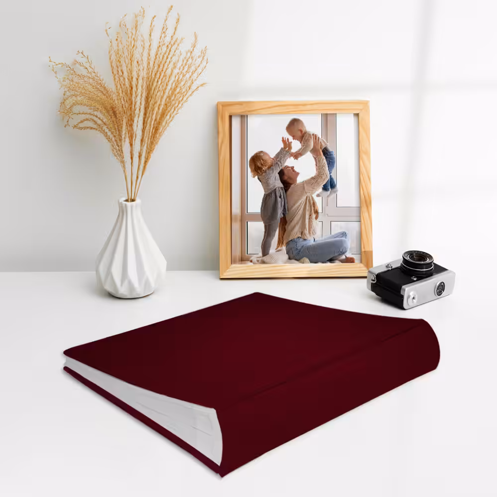 Album na zdjęcia wsuwane bordowy z miękką, aksamitną oprawą. Idealny na zdjęcia w popularnych formatach 10×15, 15×21 itd.