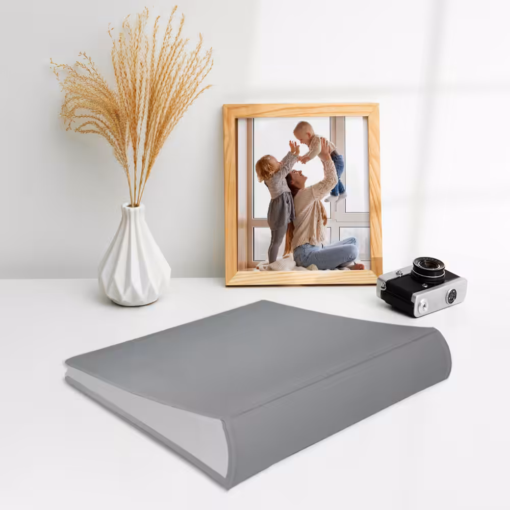 Album na zdjęcia wsuwane szary z miękką, aksamitną oprawą. Idealny na zdjęcia w popularnych formatach 10×15, 15×21 itd.
