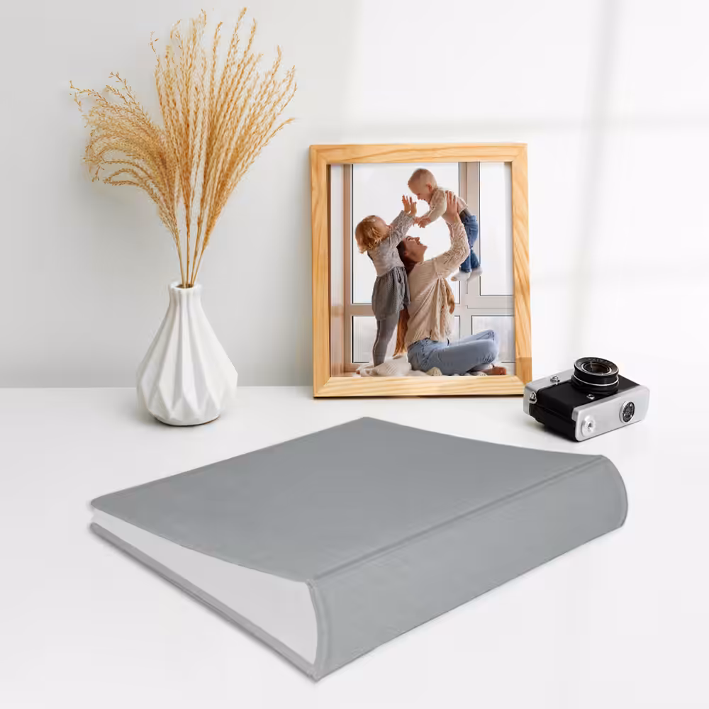 Album na zdjęcia wsuwane popielaty z elegancką, płócienną oprawą. Idealny na zdjęcia w popularnych formatach 10×15, 15×21 itd.