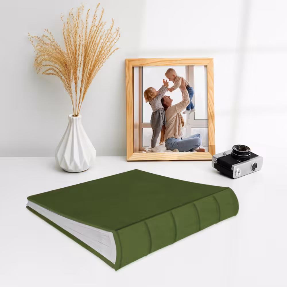 Album na zdjęcia wsuwane, skóra galanteryjna, ekoskóra – oliwkowa zieleń. Idealny na zdjęcia w popularnych formatach 10×15, 15×21 itd.