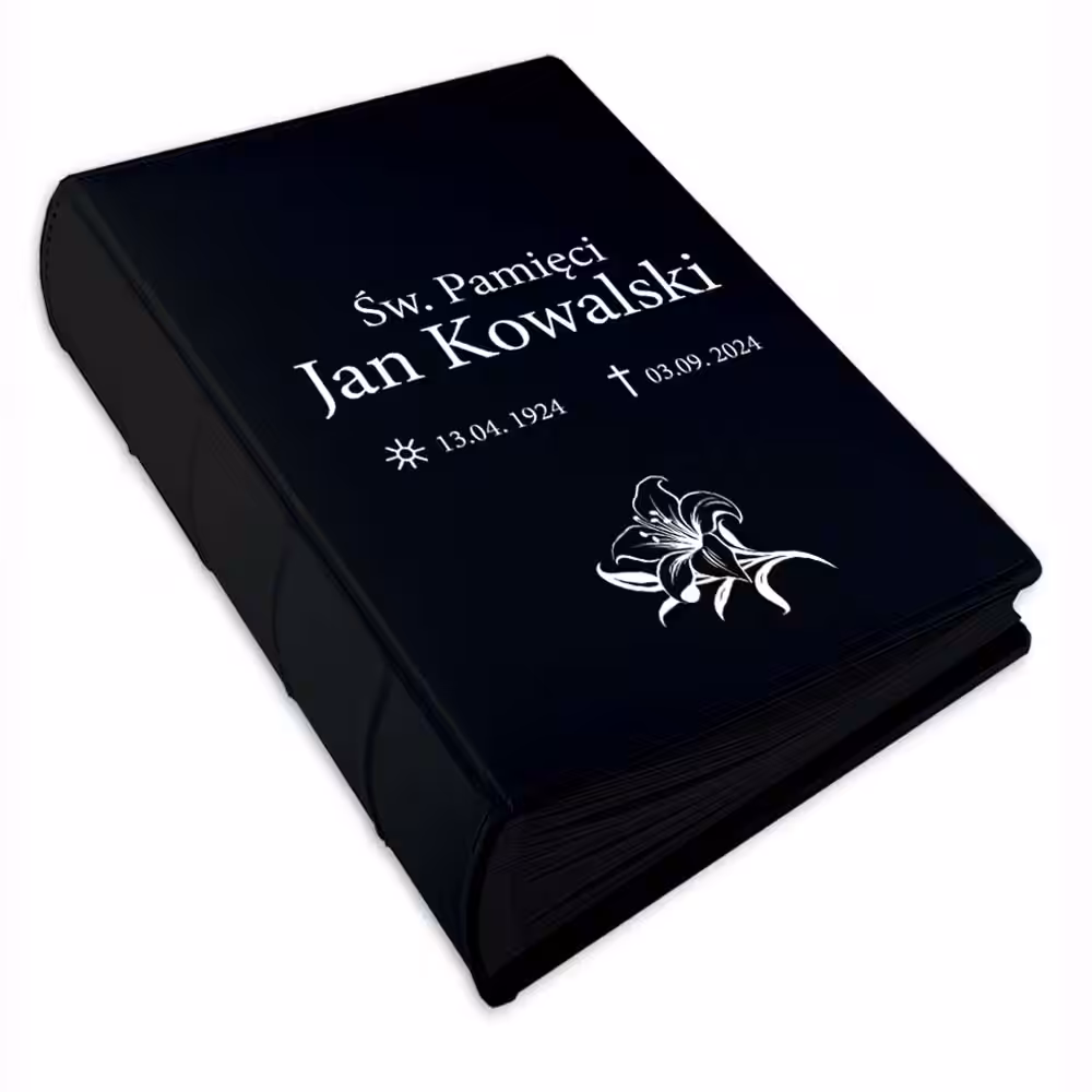 Minimalistyczny design, stonowana kolorystyka oraz symboliczne detale nadają mu żałobny charakter, czyniąc go idealnym do upamiętnienia chwil pełnych emocji i wspomnień.