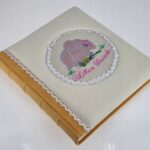 Album na zdjęcia wklejane,zawiera 40 stron z naklejonym pergaminem zabezpieczającym zdjęcia przed uszkodzeniem .Wykonany w turkusowej okładzinie introligatorskiej.