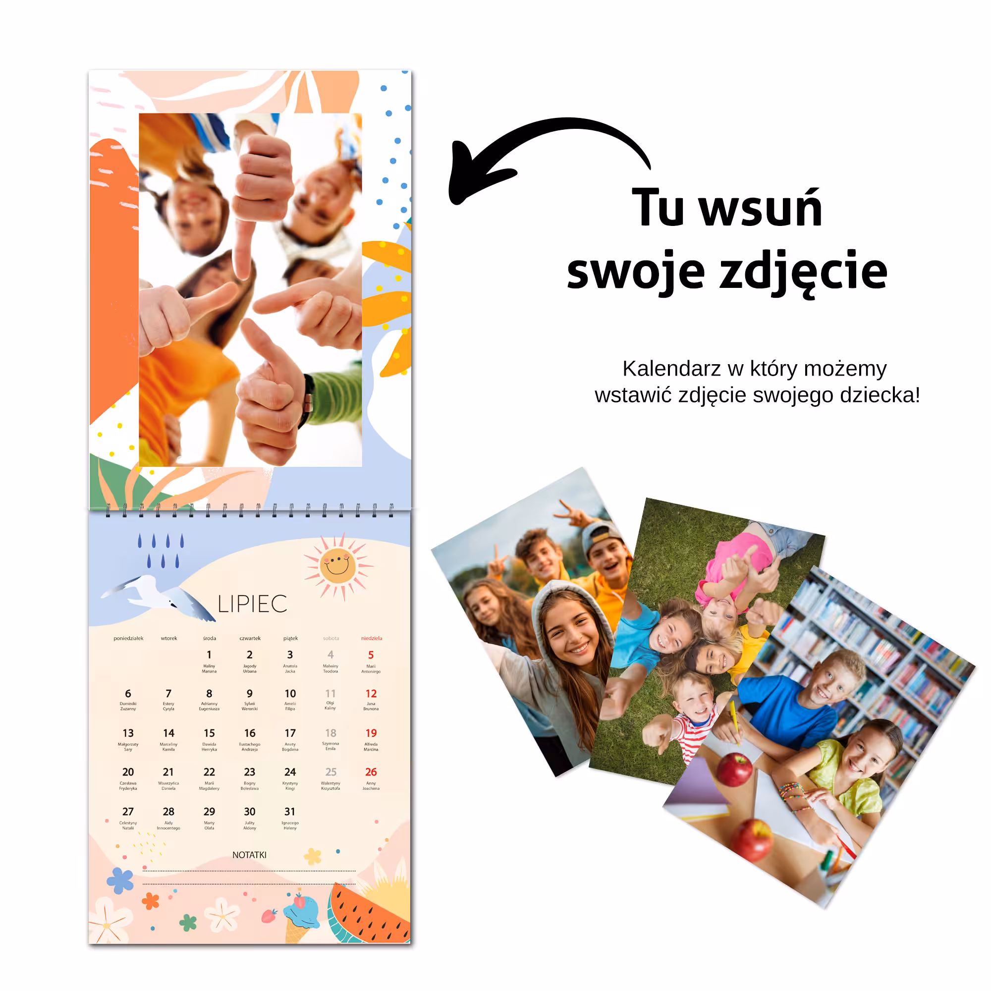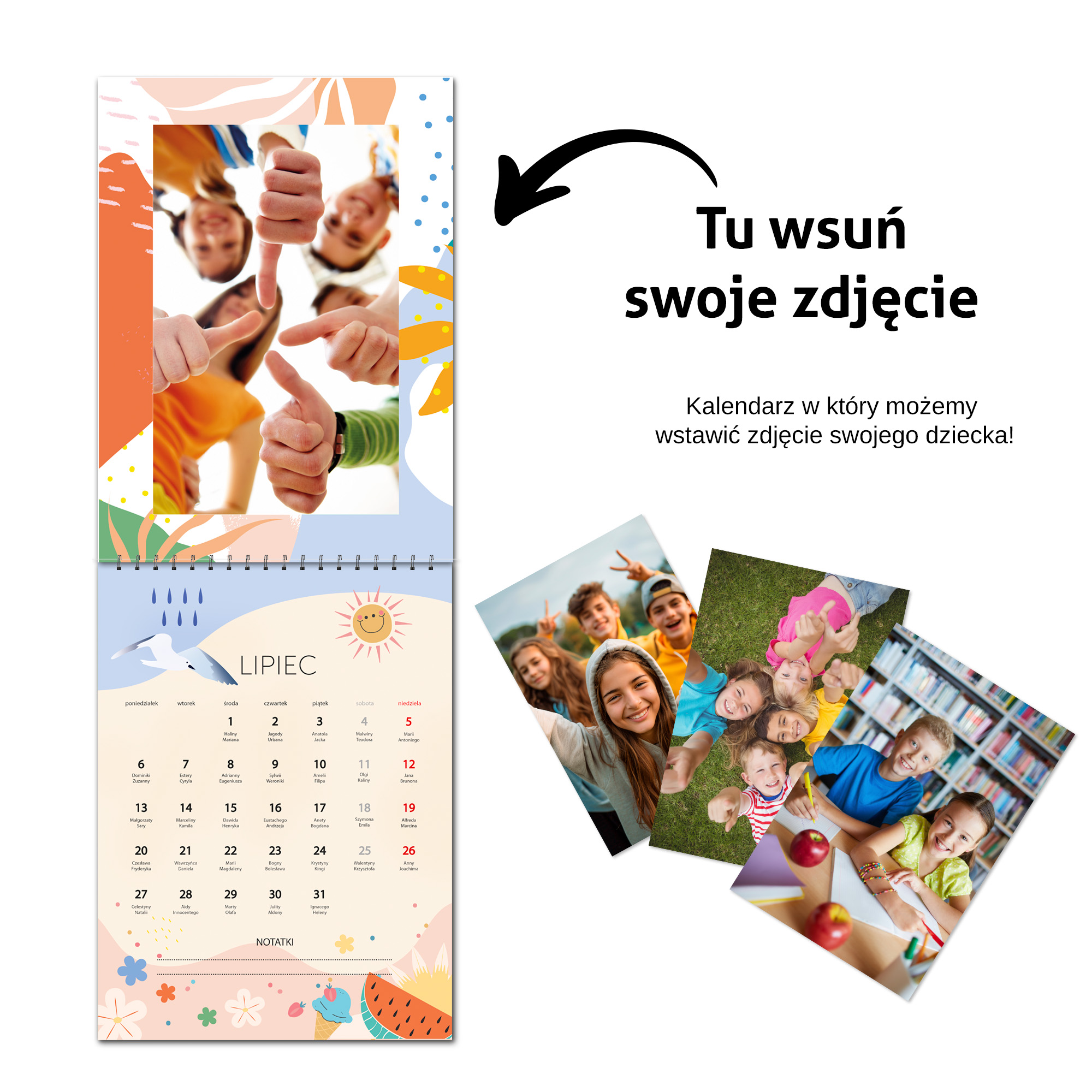 - Dla nauczycieli i wychowawców – by w klasie zawiesić kalendarz, który łączy funkcję dekoracyjną z praktyczną i angażuje dzieci (poprzez ramkę na zdjęcie).